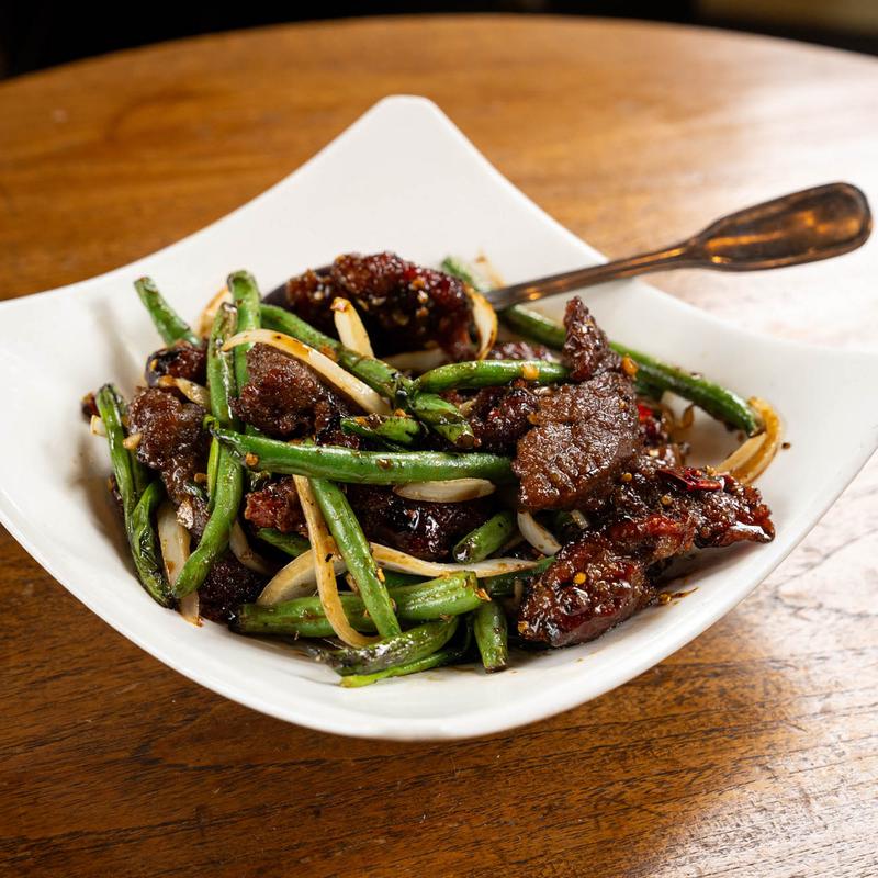 Flank steak, string beans, chili, onions, soy